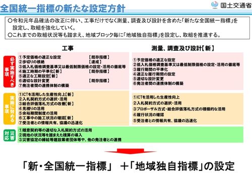 品確法改正を踏まえた全国統一指標を決定 公共工事の品質確保と担い手の中長期的な確保・育成を目的とし、令和元年6月に品確法の一部を改正し施行されました。 令和2年1月に改正品確法を踏まえた運用指針の改正を行い、都道府県や市町村を含む全ての公共工…