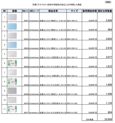 新たに石綿含有の可能性があることが判明 また、石綿(アスベスト)が含まれていることが判明しました。製品及び販売者による回収などについて、以下のとおりとなります。 販売者不二貿易株式会社 (福岡県北九州市若松区大字安瀬64-36) 製品名等珪藻土バス…